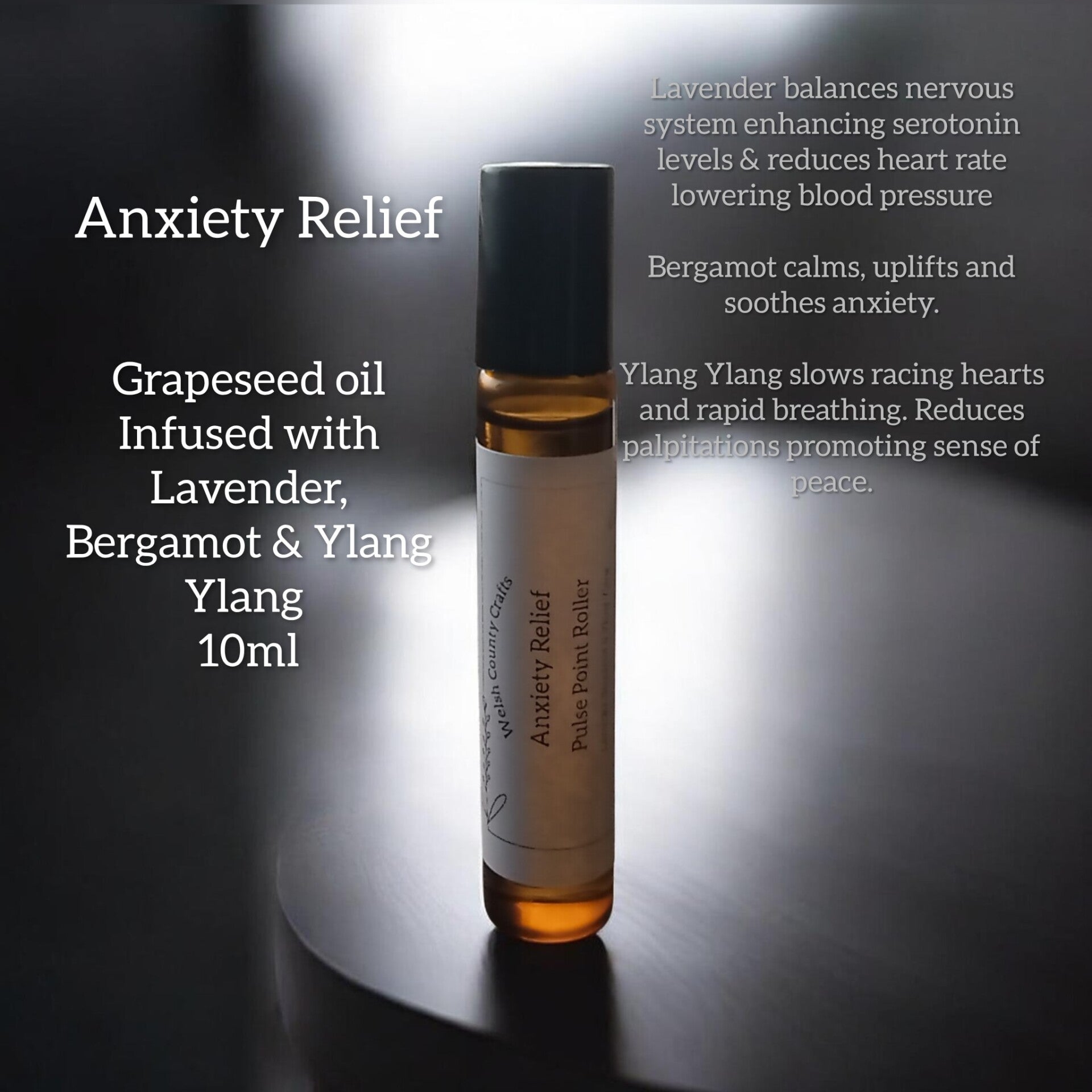 The Lavender balances nervous system, enhancing serotonin levels, reducing your heart rate and lowering blood pressure. The Bergamot calms, uplifts and soothes anxiety whilst the Ylang Ylang slows racing hearts and rapid breathing, reducing palpitations promoting sense of peace.